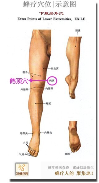 鹤顶穴在膝上部,屈膝,髌底的中点上方凹陷处。在内侧的称内膝眼,在外侧的称外膝眼。