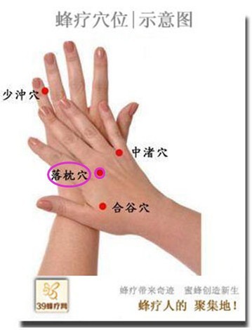 落枕穴在手背上。在手背上食指和中指的骨之间,用手指朝手腕方向触摸,从骨和骨变狭的手指尽头之处起,大约一指宽的距离上,一压,有强烈压痛之处,就是落枕穴。