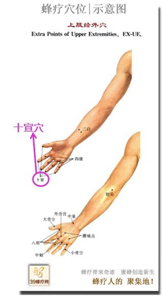 十宣穴在手峭尖端,距指甲游离缘0.1寸(指寸),左右共10穴。