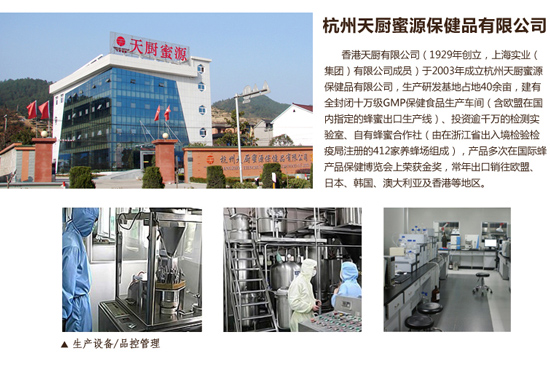杭州天厨蜜源保健品有限公司是专业从事蜂产品生产、研发、加工、销售为一体的高科技企业,是浙江省首家中外合资蜂产品企业,是浙江省骨干农业龙头企业、浙江省高新技术企业、浙江省农业标准化示范基地、浙江省农业企业科技研究开发中心,是蜂胶国家标准、蜂蜡、雄蜂蛹国家标准、蜂王浆国际标准的参与制定单位。公司通过了国家认监委与进出口检验检疫局出口产品的卫生注册,同时拥有:蜂胶、蜂王浆、蜂花粉、蜂蜡等多种蜂产品出口生产权与进出口自营权,成为我省拥有蜂产品出口生产权中,剂型最全、种类最多的进出口生产经营企业。