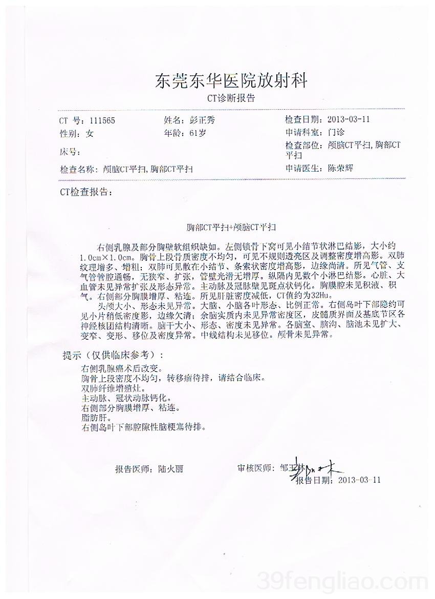 彭大姐今年61岁江西人帮儿子带孙子在广东东莞,在5年前右侧乳腺癌手术。2013年3月11日到东莞东华医院ct平扫结果。