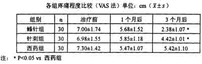 由上表可知:三组患者的疼痛程度在治疗前的差异无统计学意义(P>0.05),故具有可比性。治疗后l个月三组患者的疼痛程度无统计学意义(P>0.05);治疗后3个月,西药组与蜂针组和针刺组比较均有统计学意义(P<0.05),而蜂针组与针刺组比较无统计学意义(P>0.05);治疗后6个月三组两两比较均有统计学意义(P<0.05)。蜂针治疗患者每次针完后都觉得局部疼痛好转,活动流利。