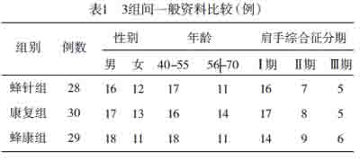 2009年5月-2010年5月广东省第二中医院针灸康复科住院脑卒中患者90例均符合纳入标准。应用PEMS软件按1:1对照产生的随机数字,将患者分为蜂针+康复训练组(蜂康组)、单纯蜂针治疗组、单纯康复训练组各30例,其中因惧怕蜂针过敏,蜂针组脱落2例,蜂针加康复组脱落1例。3组患者性别、年龄及病情分期等分布情况经检验,差异无统计学意义,具有可比性,见表1。