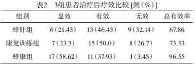 1.各组临床疗效比较采用Ridit分析,3组临床疗效比较,差异有统计学意义,说明3组治疗效果不完全相同;分别进行两两比较后,蜂针组与康复组比较差异无统计学意义;蜂康组分别对比蜂针组、康复组比较,差异均有统计学意义(P<0.05);蜂康组临床疗效优于蜂针组与康复组,见表1。