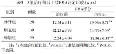 治疗前3组FMA评分积分比较,差异无统计学意义;治疗后FMA评分比较,蜂康组分别高于蜂针组、康复训练组,差异均有统计学意义(P<0.05);康复组高于蜂针组,差异有统计学意义(P<0.05),见表3。