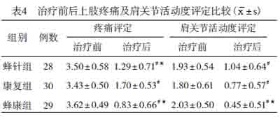 疗前3组患侧上肢疼痛及肩关节活动度积分比较,差异无统计学意义;治疗后,疼痛评分比较,蜂康组分别低于蜂针组、康复训练组,蜂针组低于康复组,差异均有统计学意义(P<0.05);肩关节活动度积分比较,蜂康组分别低于蜂针组、康复训练组,差异有统计学意义(P<0.05),见表4。