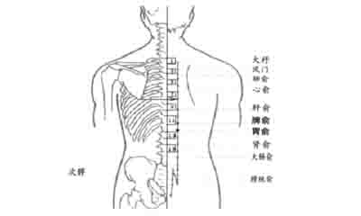 脾俞穴(BL20)、胃俞穴(BL21)均为足太阳膀胱经的腧穴。脾,脾脏也;胃,胃腑也;穴近脾胃脏腑。俞,转输之意。该二穴为脾脏与胃腑的经气转注输入之所。所以分别称为脾俞和胃俞。其特性为脾、胃的背俞穴。俞穴者位于腰背部足太阳膀胱经夹脊第一侧线穴上(背部正中旁开1.5寸),通常又称之为“背俞穴”。俞穴是脏腑之气输注之处,《灵枢、背俞》篇说:“则欲得而验之,按其处,应在中而痛解,乃其俞也。”说明背俞穴往往是内脏疾患的病理反应点。其表现可有压痛、敏感、迟钝、麻木、皮下组织变异等,具有较高的诊断价值和很好的调治内脏的作用。