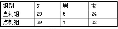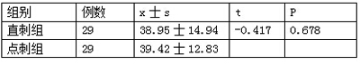 直刺组与点刺组患者一般资料经统计学分析显示:两组患者在年龄、性别构成方面比较差异,无统计学意义(P>0.05),提示两组的一般情况具有可比性。