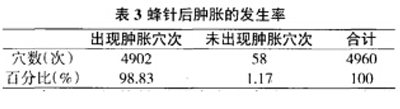 在临床蜂针治疗过程中,皮肤局部肿胀的发生是普遍存在的,通过对所有接受蜂针治疗的患者蜂针后出现肿胀现象进行观察,结果见表3: