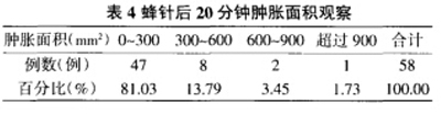 蜂针刺入机体后几分钟内,皮肤就开始出现苍白色、淡红色或红色的皮丘,但是,肿胀程度因人、因时等有异。通过对所有纳人研究的患者蜂针后20分钟局部皮肤肿胀面积进行观察统计,结果见表4。