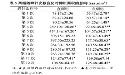 蜂针初期治疗的患者,肿胀程度会随蜂针次数及蜂针方法的不同而呈现一定的改变,通过对直刺组与点刺组患者前12次蜂针后20min肿胀面积进行观察,结果见表5: