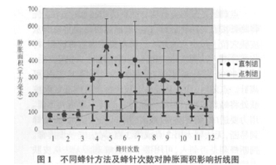 图1不同蜂针方法及蜂针次数对肿胀面积影响折线图