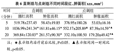 表6直刺组与点刺组不同时间段红、肿面积