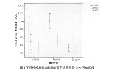 如下图2、3显示,直刺组与点刺组在不同时间患者皮肤潮红面积、肿胀面积误差条图(95%可信区间)内,直刺组均高于点刺组,提示点刺组在控制皮肤潮红面积、肿胀面积上均优于直刺组。
