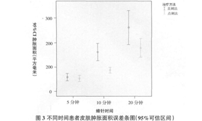 4.4直刺法与点刺法对蜂针后肿胀程度有一定影响,直刺法在5分钟、10分钟、20分钟皮肤肿胀程度均较点刺法严重。不同治疗次数时,点刺法导致的肿胀程度也较直刺法明显轻。点刺法在控制肿胀程度上明显优于直刺法。故临床在进行蜂针治疗时,如发现患者上一次治疗后肿胀程度严重者,可采取点刺法进行治疗减轻肿胀程度。