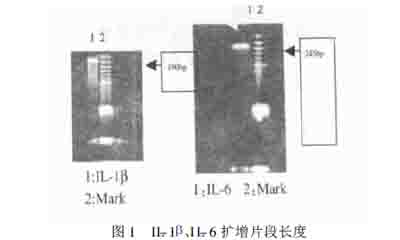 2.1扩增片段长度以提取的RNA作为逆转录反应的模板,IL-1B、IL-6mRNA最终扩增出的片段分别长为190bp和245bp,与设计的IL-1B、IL-6mRNA扩增片段长190bp[wxk2]和245bp相一致。见图1。