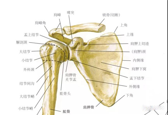 (一)骨:肩关节由三块骨(锁骨、肩胛骨和肱骨)构成,组成四个关节