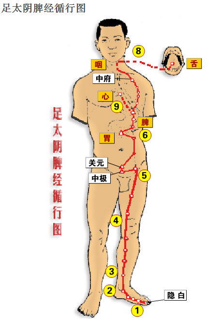 1.经脉循行:起于足大趾末端(隐白),沿着大趾内侧赤白肉际,过大趾本节后半圆骨,上行至内踝前,再上腿肚,沿胫骨后交出足厥阴经之前,经膝、股部内侧前缘入腹,属脾,络胃,过横膈上行,挟食管两旁,连系舌根,分散于舌下。胃部的支脉:向上再通过横膈,流注于心中,与手少阴心经相接。