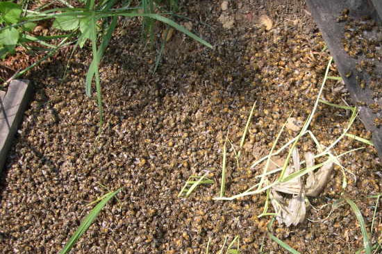 在任何蜂场,如果在蜜粉源开花季节,蜂箱内外出现大量的死蜂,而且死蜂后足仍带有花粉团,可以怀疑蜜蜂为农药中毒。再根据中毒蜜蜂呈现的症状,明确蜜蜂死于何种类型的农药中毒,采取相应的防治措施。此外,蜜蜂中毒除表现为采集蜂大量死亡外,严重时,箱内幼虫也会中毒死亡。中毒幼虫常从巢房脱出,称为“跳子”。许多巢房的封盖会被咬开,内有许多死亡的蛹。蜂群的严重中毒常使箱内大量内勤蜂丧失,一部分蜜蜂蛹可能死于饥俄和缺乏照料。一般情况下,蜂王由于吃哺育蜂分泌的王浆会侥幸躲过中毒,可能会随蜂箱内剩余蜜蜂弃箱逃亡。