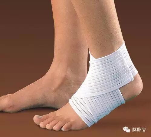 三、冷敷的同时或冷敷后可用绷带、三角巾等布料加压包扎踝关节周围。亦可用数条宽胶布从足底向踝关节及足背部粘贴、固定踝关节,以减少活动度。无论包扎或用胶布粘贴均应使受伤的外踝形成足外翻或受伤的内踝形成足内翻,以减轻对受伤的副韧带或肌肉的牵拉,从而减轻或避免加重损伤。