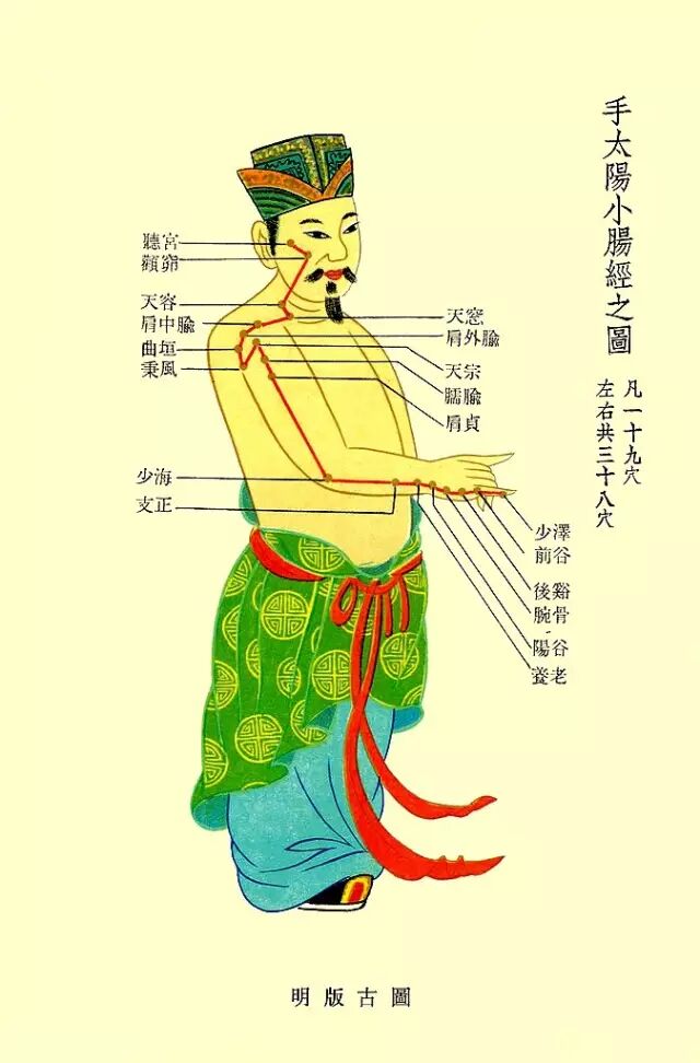 手太阳小肠经上有19个穴位,均为双穴,左右各一,共38个。起于小指尺侧指甲旁0.1寸的少泽穴,经过手掌和腕部尺侧,从前臂外侧的后缘上行,在肩胛骨部位绕行,止于耳屏前、下颌骨髁状突后方张口凹陷处的听宫穴。