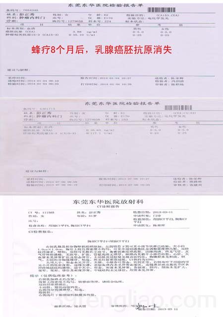 蜂毒可以将患有癌胚抗原从16.65降到3.88 ,肿瘤抗原从117降到35.