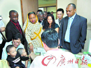 2009年4月18日非洲国家科摩罗副总统伊吉利卢(右一)与夫人(右六)一行参观了中国中医无痛蜂疗法发明人成永明教授的蜂疗操作现场。总统对蜂疗法非常感兴趣。并拿起蜂疗盒端详了许久,希望能引进蜂疗项目。