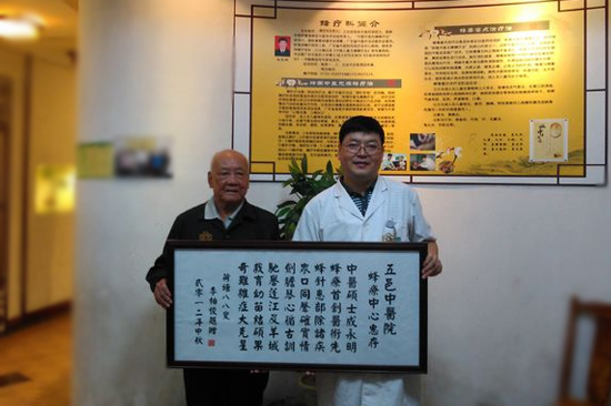现年88岁的老者李阿伯,多年来一直坚持蜂疗保健养生,特别在三伏天以及三九天更是如此。以前,没有接受蜂疗时,老人家患有老慢支、肺气肿咳喘、高血脂、高血压、腰膝疼痛等疾病。经过多年的蜂疗,现在各方面的情况都有了明显的进步。故而开心的赠匾与成永明教授,感谢多年来为他的健康保健护航。其实,长期进行蜂疗保健养生的成年人及儿童每年有近30万人次之多。连成永明教授自己也每周给自己进行1次蜂疗。