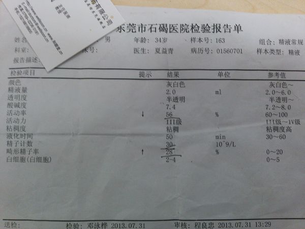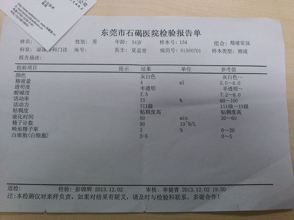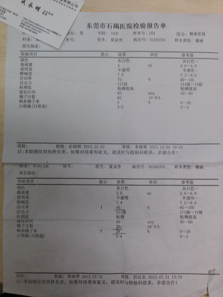 于是前来就诊。测精液常规检查显示:精液量只有不到1毫升(正常是2~6毫升),精子活动率45%(正常60~100%),精子畸形率32%(正常0~20%),这种情况的“作业”从专业角度讲是很难让老婆怀上孩子的。