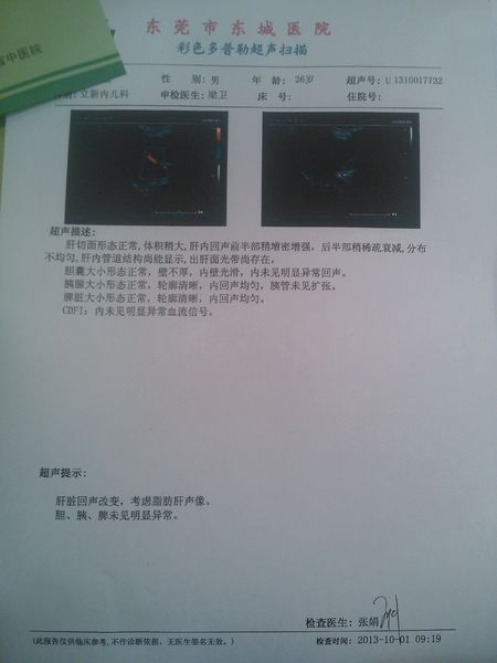 患者在广东省中医院成永明教授岭南无痛蜂疗工作室接受蜂疗前在东莞市东城医院做的B超检查显示为脂肪肝。