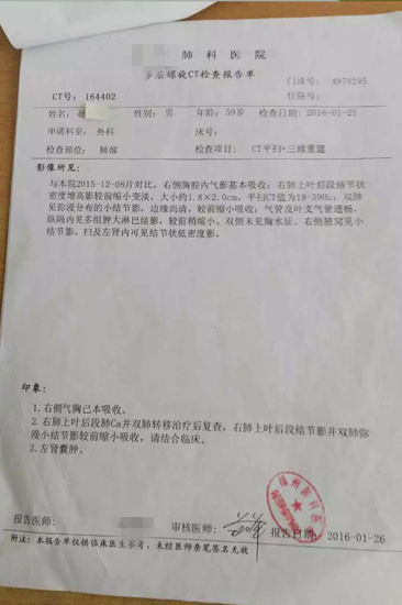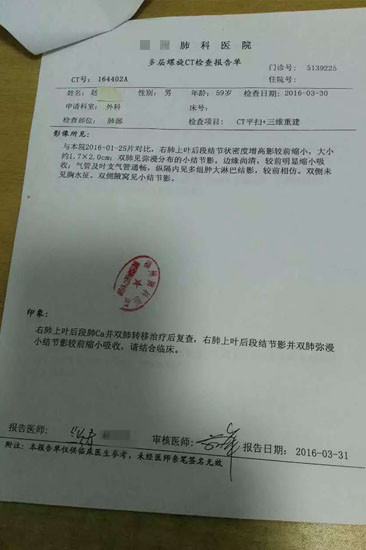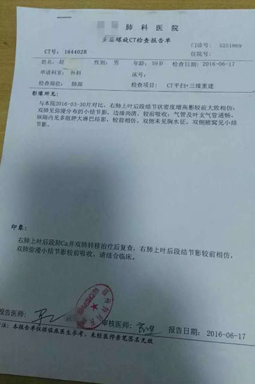 刚刚收到的福州赵先生发的检查报告,前三张截图是2016年月底截屏,CT报告时间依次是:2015年12月8日、2016年1月25日、3月30日、6月17日。蜂疗整整半年时间,癌胚抗原指数持续下降。祝福赵先生!