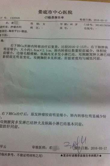 四个月的时间,肿瘤从4.7cm缩小到1.4cm!让人鼓舞!这一秒不绝望,下一秒才有希望!娄底袁姐当时可是心灰意冷,还是蜂疗综合疗法救了她!祝福!