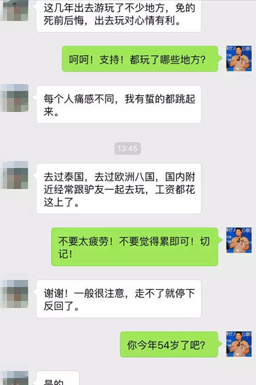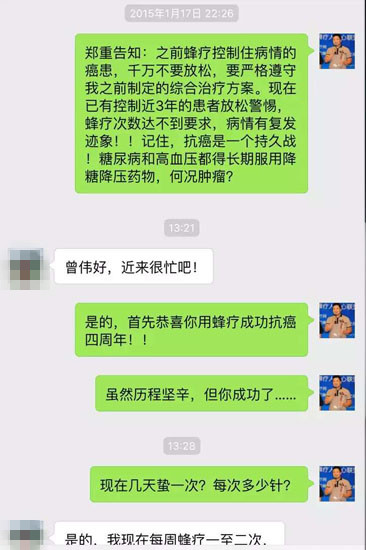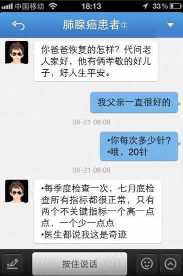 贺先生学会后,遂回家治疗。2013年8月,患者欣喜的告诉我:每季度检查一次,7月底的检查所有指标都很正常,只有2个不关键指标一个高一点点,一个低一点点。。。(最后一张照片是2013年8月的聊天纪录截屏)http://blog.sina.cn/dpool/blog/s/blog_8848482b0101acjg.html?type=3