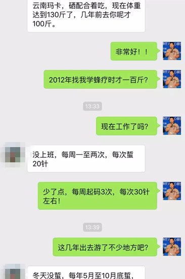 肺腺癌患者贺先生(化名),今年54岁,湖南郴州人。成功蜂疗抗癌整整四年!!!蜂疗前体重100斤,现在体重达到130斤,还时常出国旅游,在国内和驴友参加徒步户外运动!!!