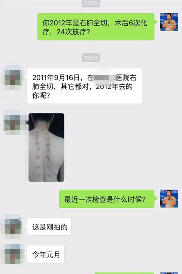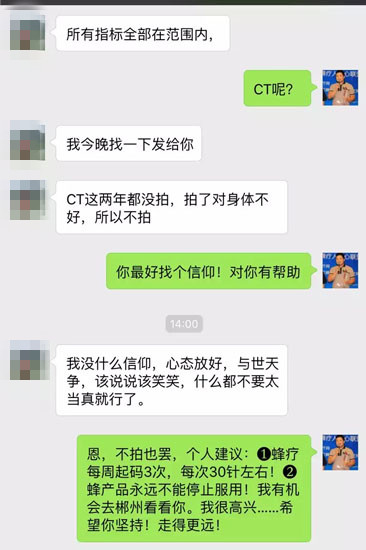 2011年9月19日,患者在长沙湘雅医院做了右肺全切手术,术后6次化疗,24次放疗,一系列治疗后的副作用让患者痛苦不堪。2012年4月,患者在《知音励志》杂志上看到关于我用蜂疗治疗晚期肺腺癌父亲的报道后,找到我学习蜂毒抗癌法。