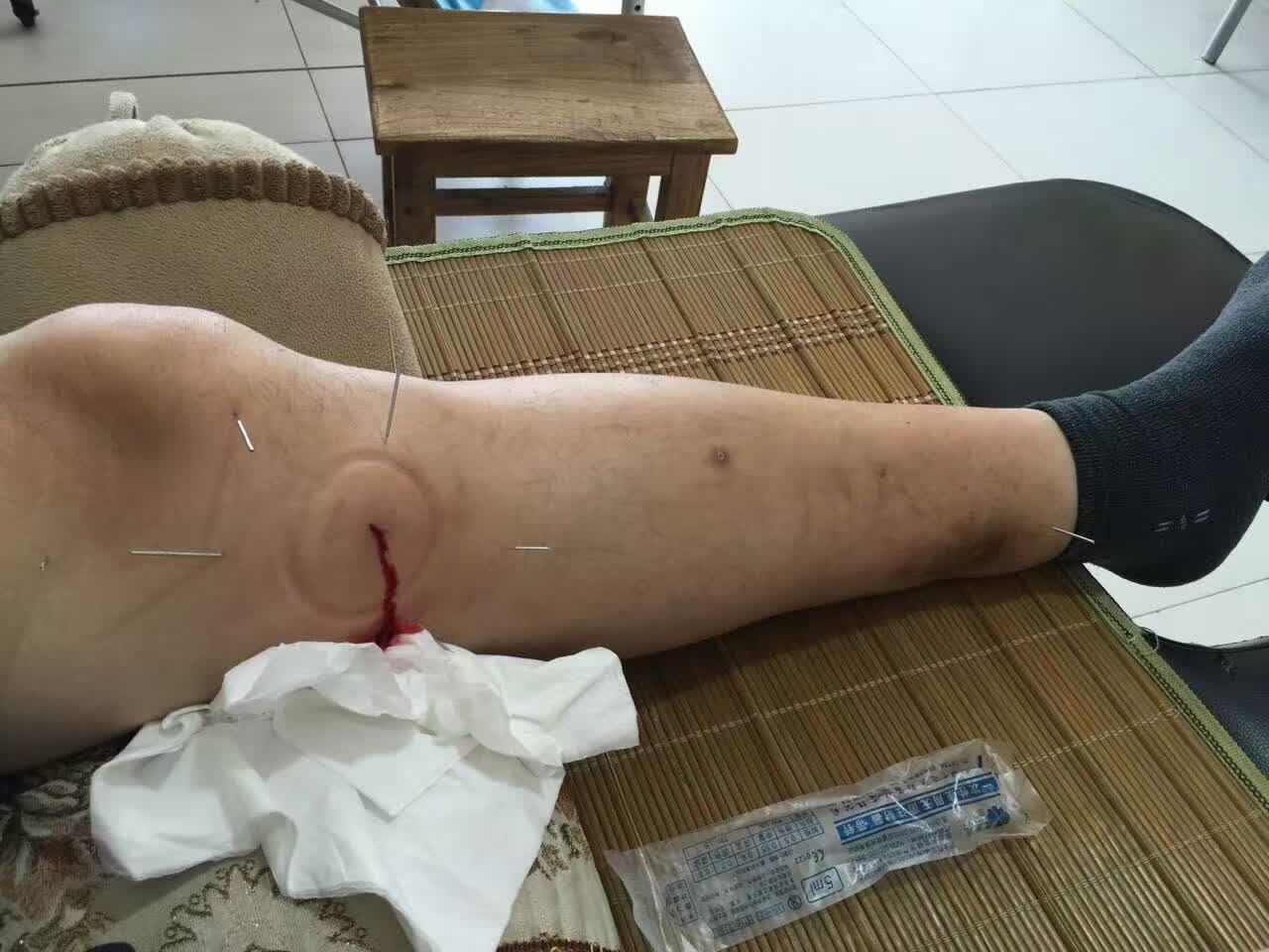 老徐同志十天前在负重情况下扭伤膝盖,膝内侧随即肿起馒头大一个大包。软中带硬,非液压感。排除积液可能,围刺肿块,于中央处火针焠刺,出黑血约20毫升,肿消