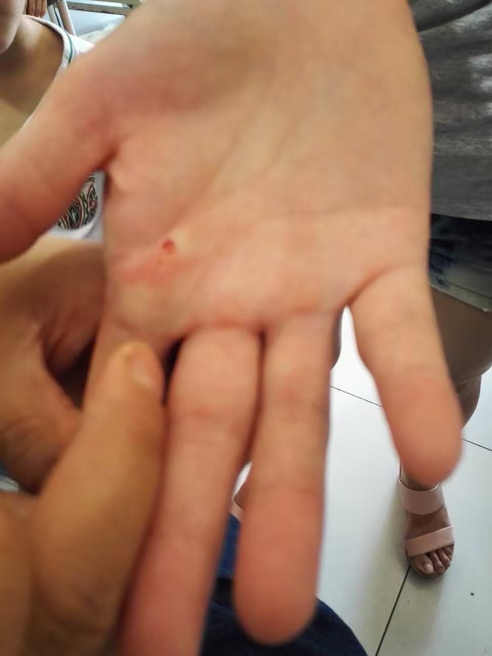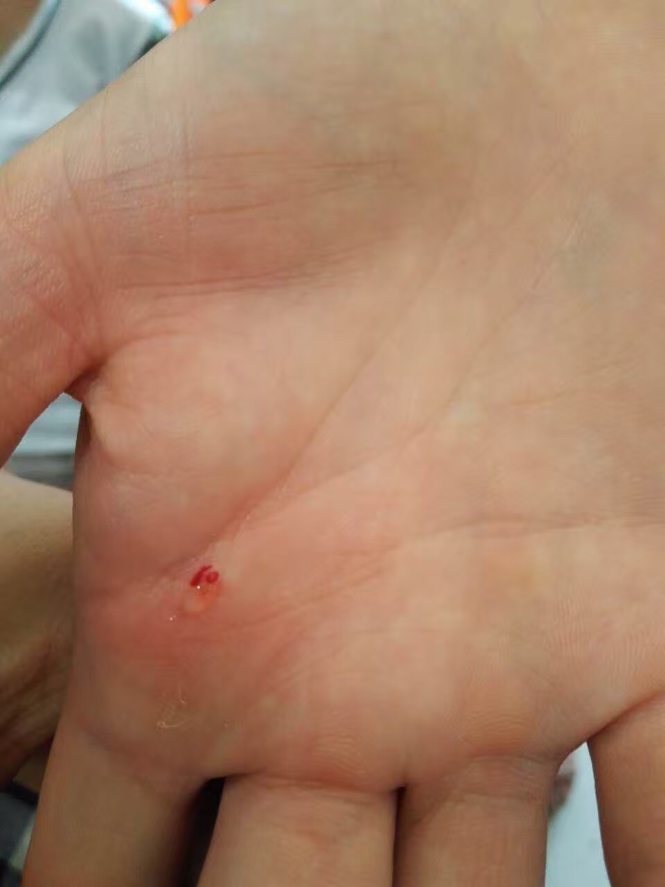 汽车美容院的老板娘右手掌指关节鼓起一个硬疙瘩,非常痛!用刃针点破,流出一滴液体。疼痛马上减轻了。其实就是腱鞘炎,与她的工作有关。