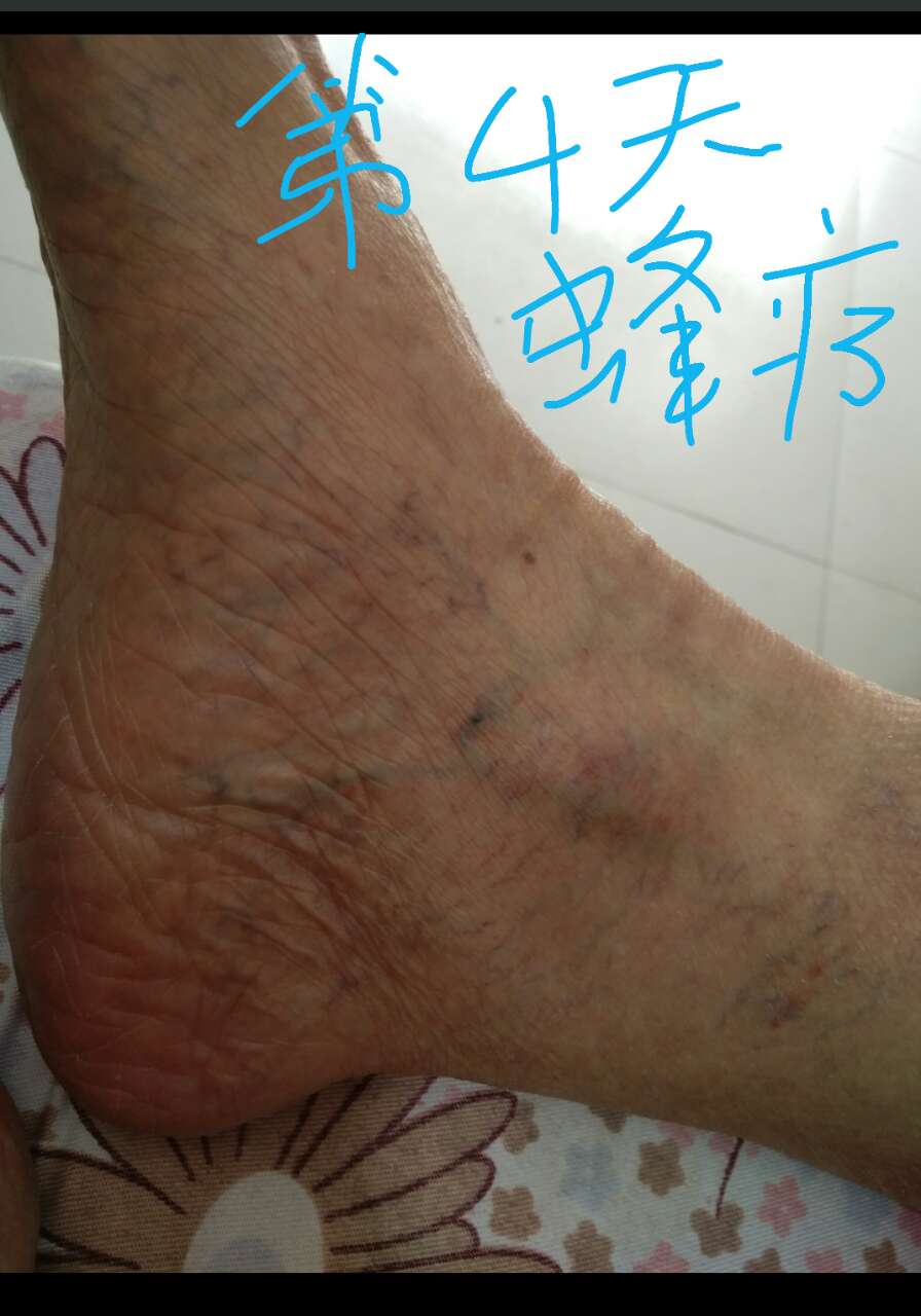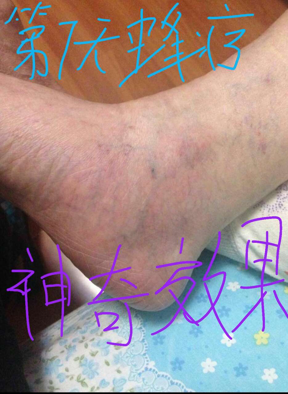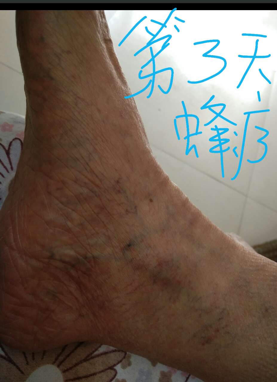 黑龙江省双鸭山市宝清县,79岁 老太太脉管炎,有她的小女儿带着慕名来我蜂疗所治疗类风湿,老人家心脏靠吃药维持!浑身都不舒服,膝盖,后背都疼。老人家15年前在黑龙江一家医院做过蜂疗效果很好。当老人家把鞋子拖到我看到她的脚内侧青血丝乱绕,明显的脉管炎状态。我告诉老人脚得了脉管炎,难怪大腿很不舒服啊!当时我拍照了蜂疗前的照片留作对比。