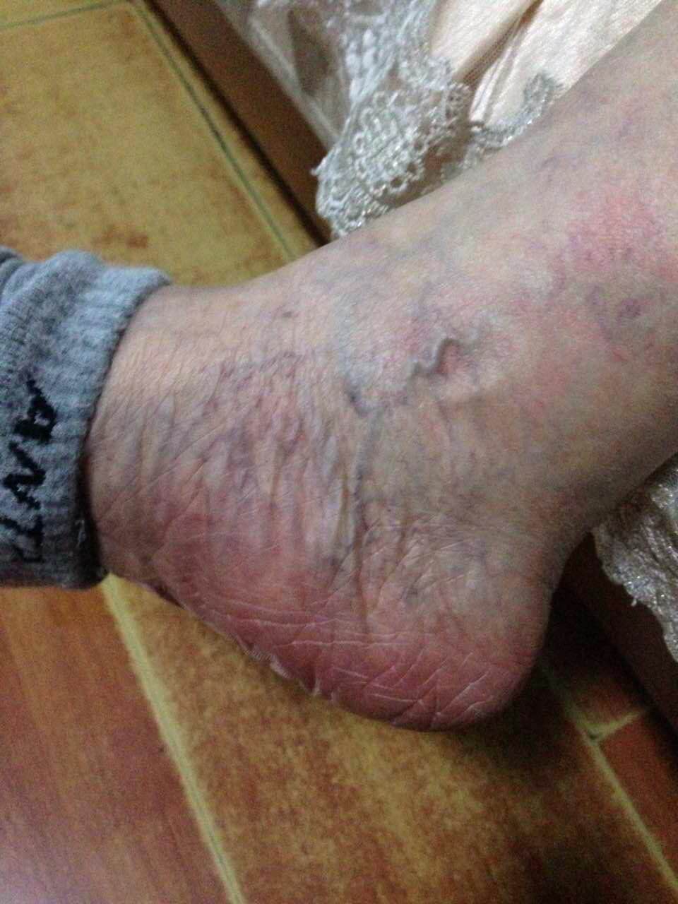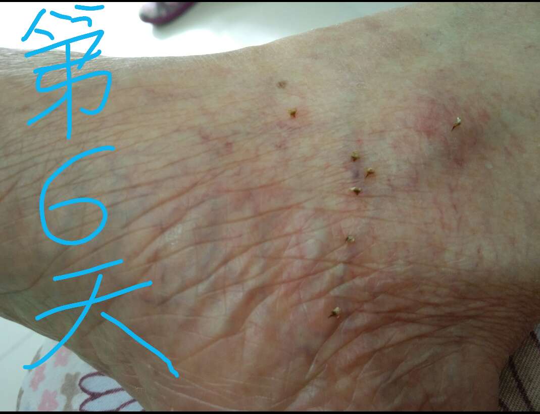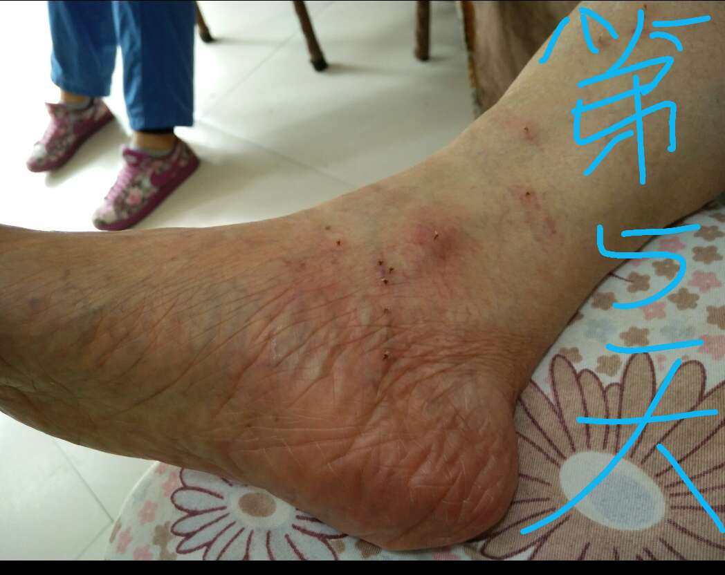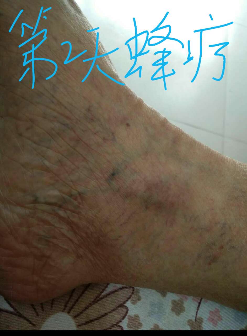 黑龙江省双鸭山市宝清县,79岁 老太太脉管炎,有她的小女儿带着慕名来我蜂疗所治疗类风湿,老人家心脏靠吃药维持!浑身都不舒服,膝盖,后背都疼。老人家15年前在黑龙江一家医院做过蜂疗效果很好。当老人家把鞋子拖到我看到她的脚内侧青血丝乱绕,明显的脉管炎状态。我告诉老人脚得了脉管炎,难怪大腿很不舒服啊!当时我拍照了蜂疗前的照片留作对比。