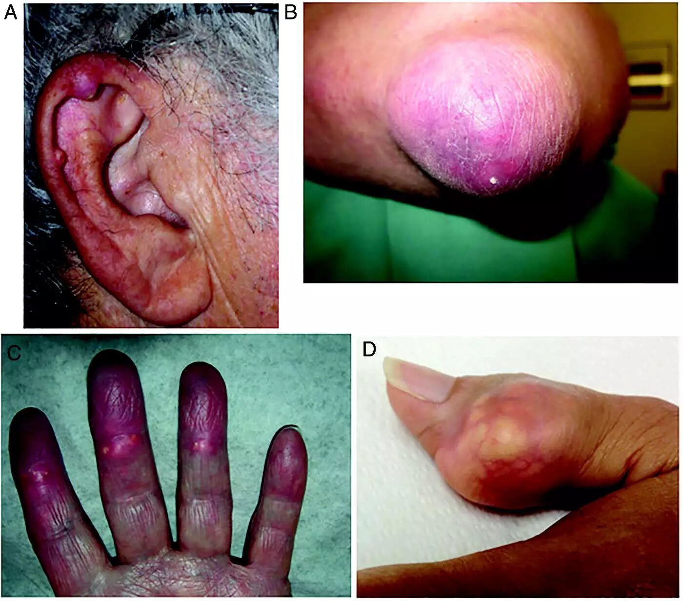 皮下痛风石是长期显著的高尿酸血症未获满意控制,体内尿酸池明显扩大,大量单钠尿酸盐(MSU)晶体沉积于皮下、关节滑膜、软骨、骨质及关节周围软组织的结果。其发生的典型部位是耳廓(图1A),也常见于反复发作的关节周围,以及鹰嘴(图1B)、跟腱、髌骨滑囊等处。图1C、D为指腹痛风石。外观为皮下隆起的大小不一的黄白色赘生物,皮肤表面菲薄(图1D),破溃后排出白色粉状或糊状物,经久不愈。皮下痛风石常与慢性痛风石性关节炎并存。关节内大量沉积的痛风石可造成关节骨质破坏、关节周围组织纤维化、继发退行性改变等。临床表现为持续关节肿痛、压痛、畸形、功能障碍。