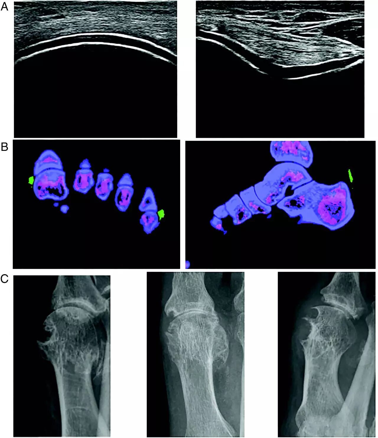 (C)骨侵蚀,第1跖趾关节X线片表现。