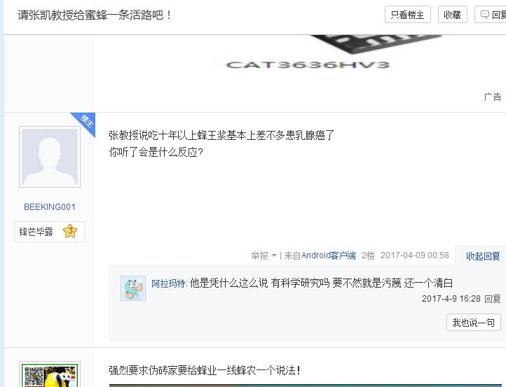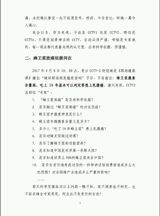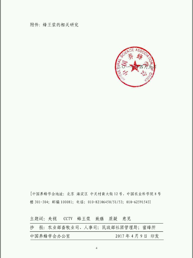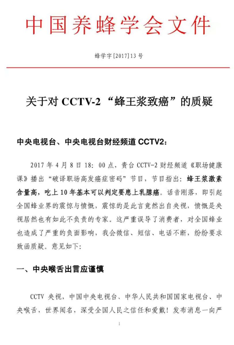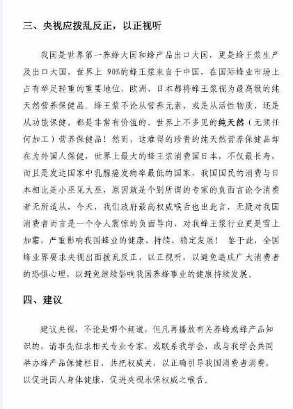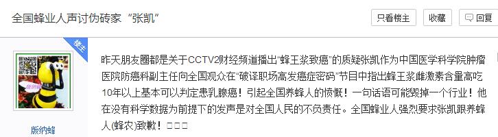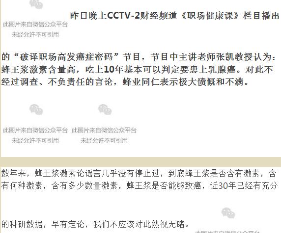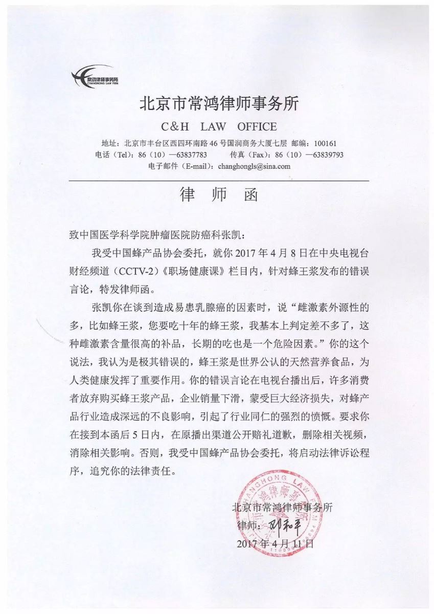 中国蜂产品协会针对中国医学科学院肿瘤医院防癌科张凯于2017年4月8日在中央电视台财经频道(CCTV-2)《职场健康课》栏目中发表诋毁蜂王浆的错误言论,召集有关专家进行会商研究,决定就此事向张凯发出律师函,要求在原播出渠道公开赔礼道歉,删除相关视频,消除不良影响。否则,协会将启动法律诉讼程序,追究其法律责任。