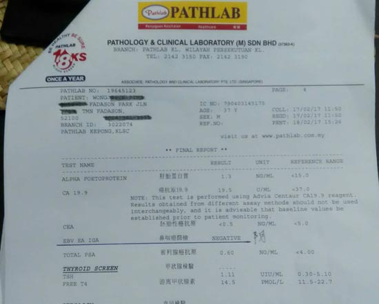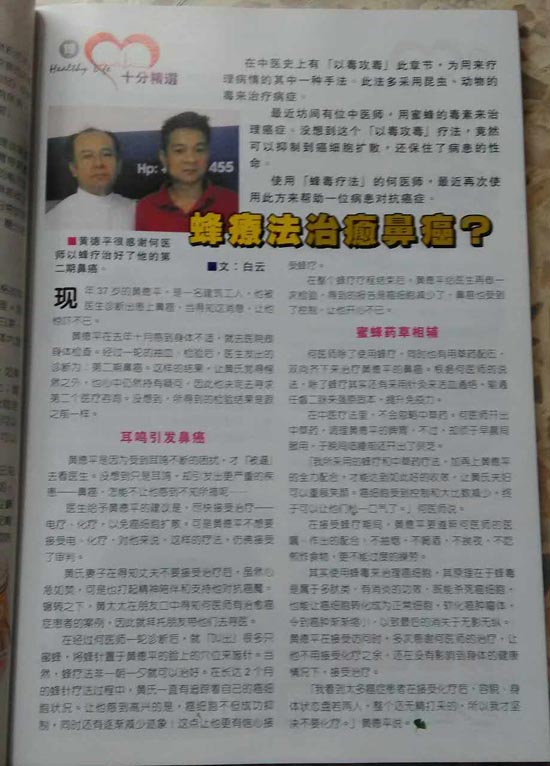 我治好鼻咽癌第二期的案例刊登于马来西亚的二月份健康生活杂志第143期,此杂志在泰国,新加坡和印度尼西亚的华人书报社可买到;患者黄德平先生37岁吉隆坡人,他开始治疗时10/6/16的验血报告显示的鼻咽癌筛检指数是175,超过了127的最低指数,治疗了2个月再验血而于24/8/16的指数呈阴性 Negative每天早上咳嗽的痰也没有血块了; 我交待黄先生每半年进行验血追踪检查直到第三年,过后每年检查一次至第7年,他于今年2月18日的验血检查的指数还是呈阴性,目前每个星期一次仍然到来我处接受针灸和蜂疗的巩固治疗。