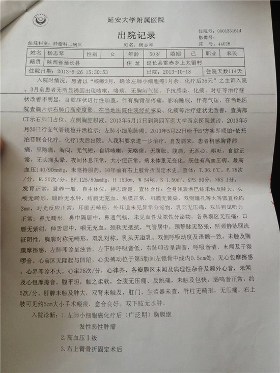杨阿姨,今年55岁,在2013年5月20日被第四军医大学西京医院确诊为左肺小细胞肺癌,无手术机会,只能化疗。后转入延安大学附属医院继续化疗,入院时诊断:左肺小细胞肺癌化疗后(广泛期)胸膜继发性恶性肿瘤,连续住院114天,化疗8次……化疗副作用大,2014年3月23日,患者家属邀请我到了延安延长县,患者当时因化疗后异常虚弱,上卫生间都要家人搀扶,食欲不振,消瘦,精神状态不佳……我给患者制定了蜂疗综合治疗方案后,嘱其家人遵照执行……蜂疗期间患者症状一步步缓解,疗效显著!