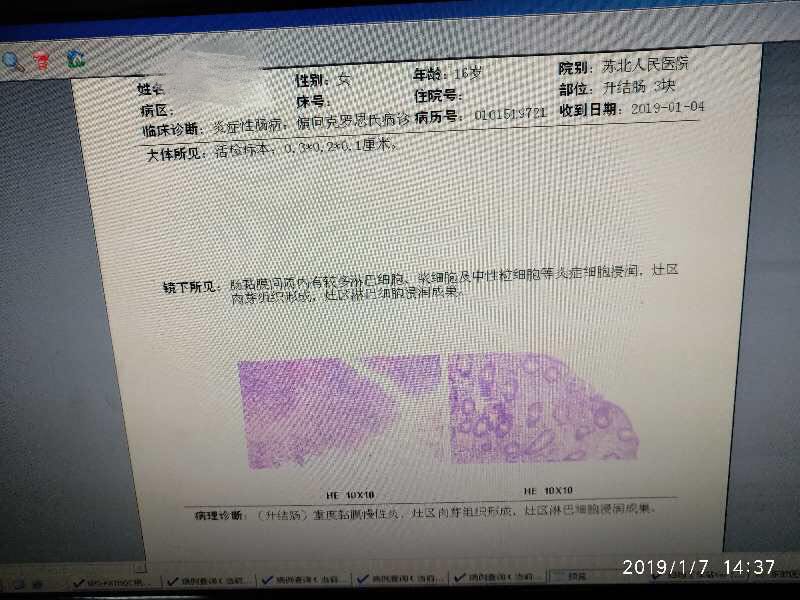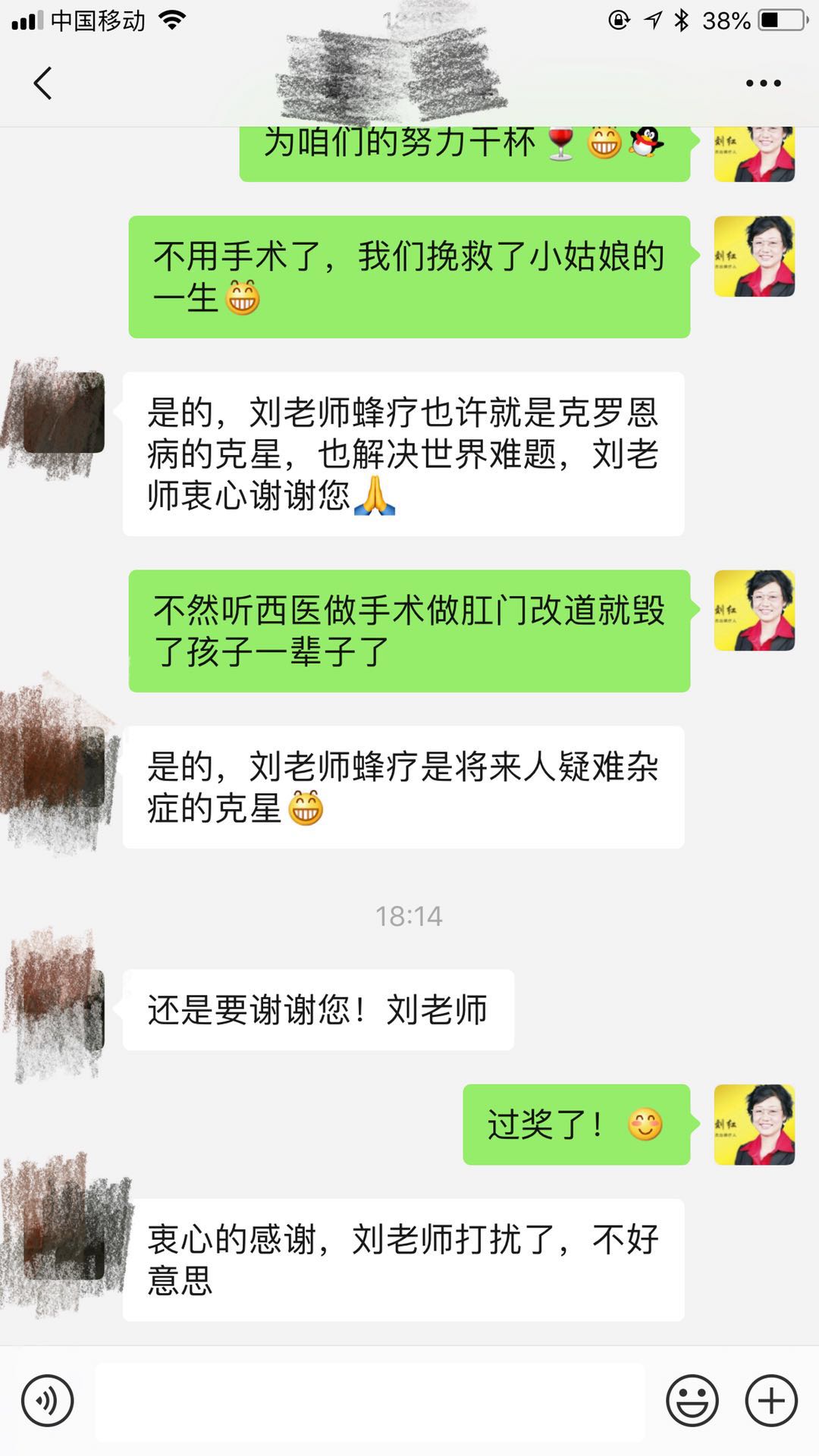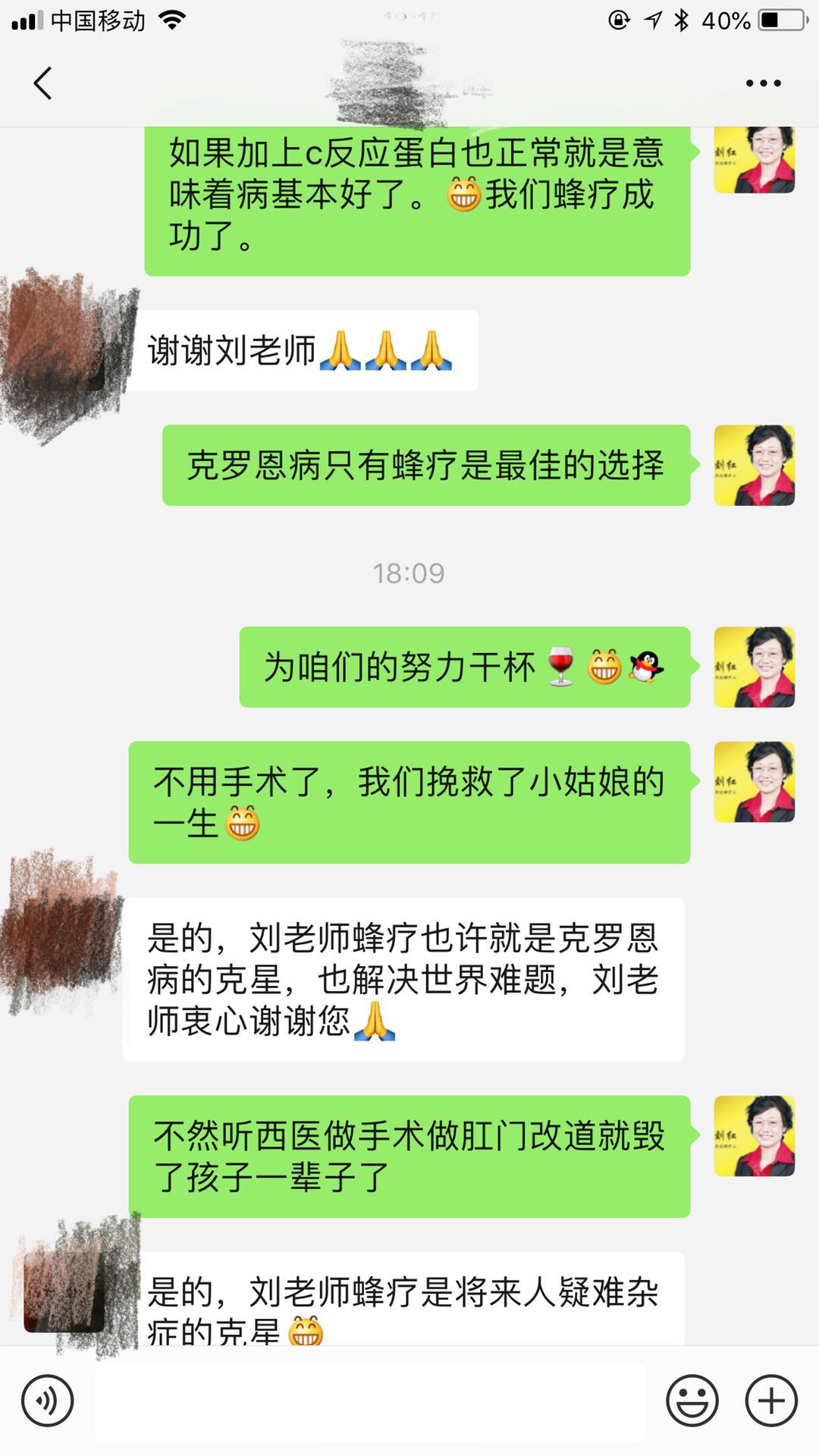 上月底,学生的外甥女,16岁,在苏北人民医院确诊为克罗恩病。院方让手术,学生电话咨询与我,我建议保守治疗,药物配合蜂疗,第二天即来我处行蜂针并教了他后面用哪些穴位,嘱咐他回去继续蜂疗。旋即他和孩子到南京医院住院,院方也是建议手术,跟我商量我还是坚持建议保守治疗,然后住院期间药物的同时每天蜂针15到20针。三天后患者腹痛,拉稀,便血的症状消失。15号化验结果,血沉,c反应蛋白全部恢复正常。无需手术了。留院观察10天即可出院了。而同病房的一个孩子年龄相仿,发病时间差不多,病情一样,但他单纯用的药物,没有配合蜂疗,情况就比用蜂疗的这个孩子严重,各项指标还很高,还在继续住院治疗。克罗恩病 是一种原因不明的肠道炎症疾病,目前尚无根治的办法。属于免疫系统疾病。而蜂疗作为一种纯天然生物疗法能调节免疫,安全,有效,不失为克罗恩患者的一个福音。