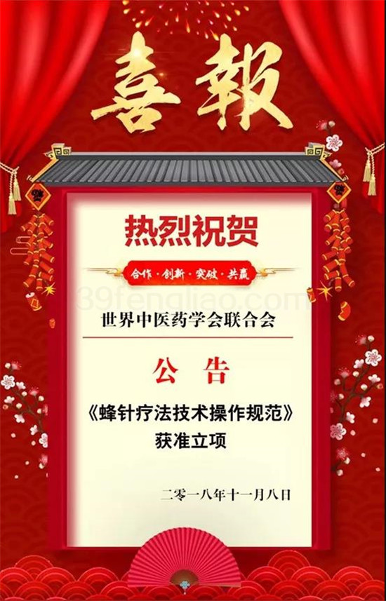 2018年蜂界迎来了一项里程碑式的成就:2018年11月9日,在首届世界蜂疗大会上发布的由李万瑶会长主编起草、39蜂疗网助力完成的《蜂针疗法技术操作规范》获准立项。此标准的立项象征着蜂界标准化运营又达到了崭新的目标。