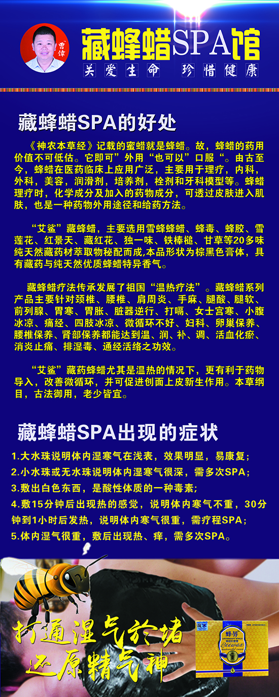 藏药蜂蜡疗是在传统蜡疗、温敷疗法延伸出来的一种新型实用高效疗法,在蜂蜡的基础上加上了蜂毒、蜂胶、藏红花、独一味、狗脊、杜仲、桑寄生等十多种中草药粉配置而成。它以经络学说为原理,现代医学为依据,根据分子医学理论、生物医学全息理论以及内病外治、异病同治的中医理论,通过刺激穴位、疏通经络和药力热传导,安全高效祛除体内的风、寒、湿、热、毒,达到治疾病、防未病,扶本固元,促进新陈代谢,增强机体免疫力的功效。适宜寒湿体质患者,祛湿散寒。
