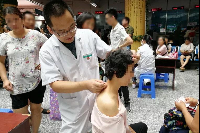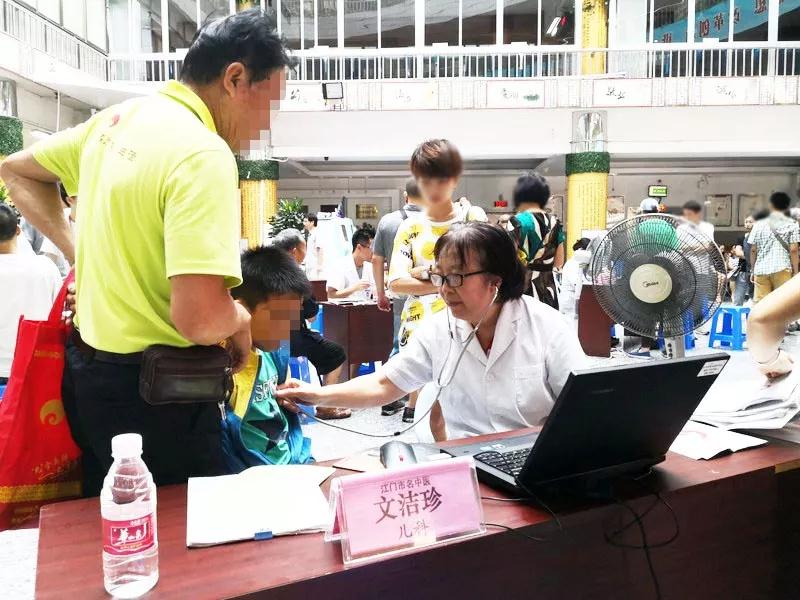 ▲江门市名中医莫健斌为患儿检查肢体情况