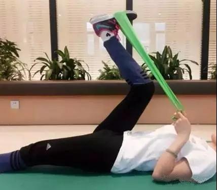 ④腘绳牵拉方法:仰卧位,一侧腿屈髋屈膝,在足底加一条弹力带,双手握住弹力带两端,脚缓慢发力蹬伸,使大腿后侧有明显牵拉感。