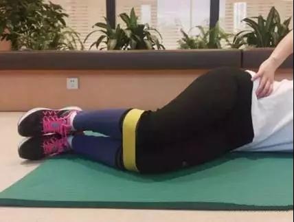 ①蚌式训练:动作要点如图:侧卧,两膝外侧加一条弹力环,臀肌发力使膝外展,每组15个,每次训练3组,组间休息30s。